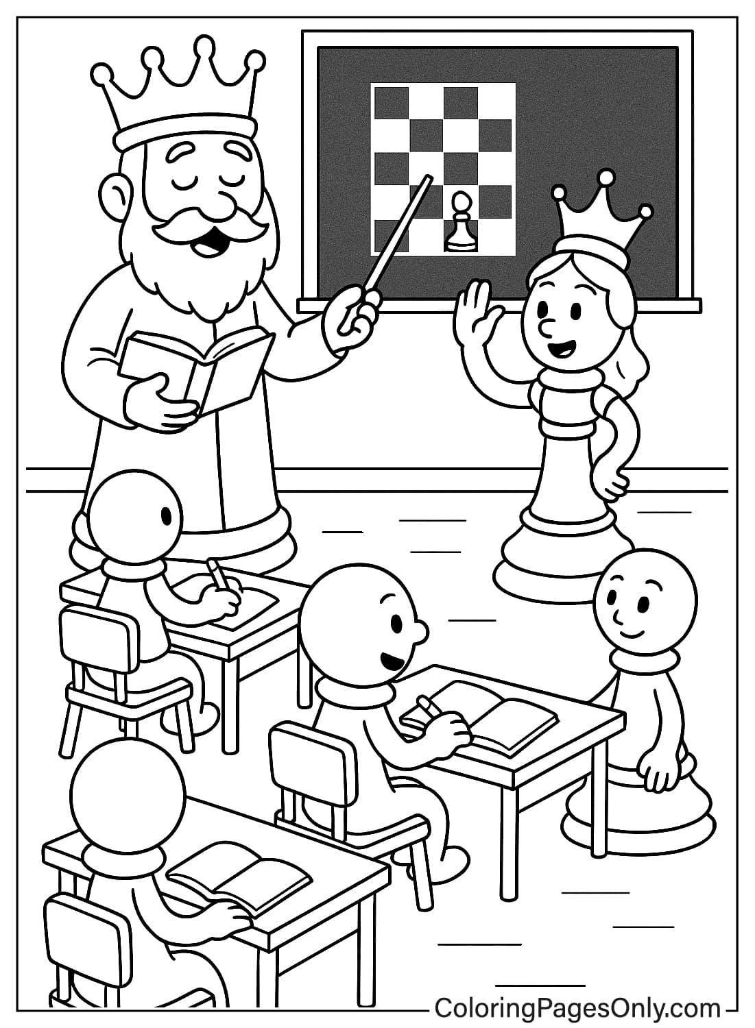 See the King teaching a class of Pawns, while the Queen proudly raises her hand – or the royal couple going on a picnic on the chessboard!