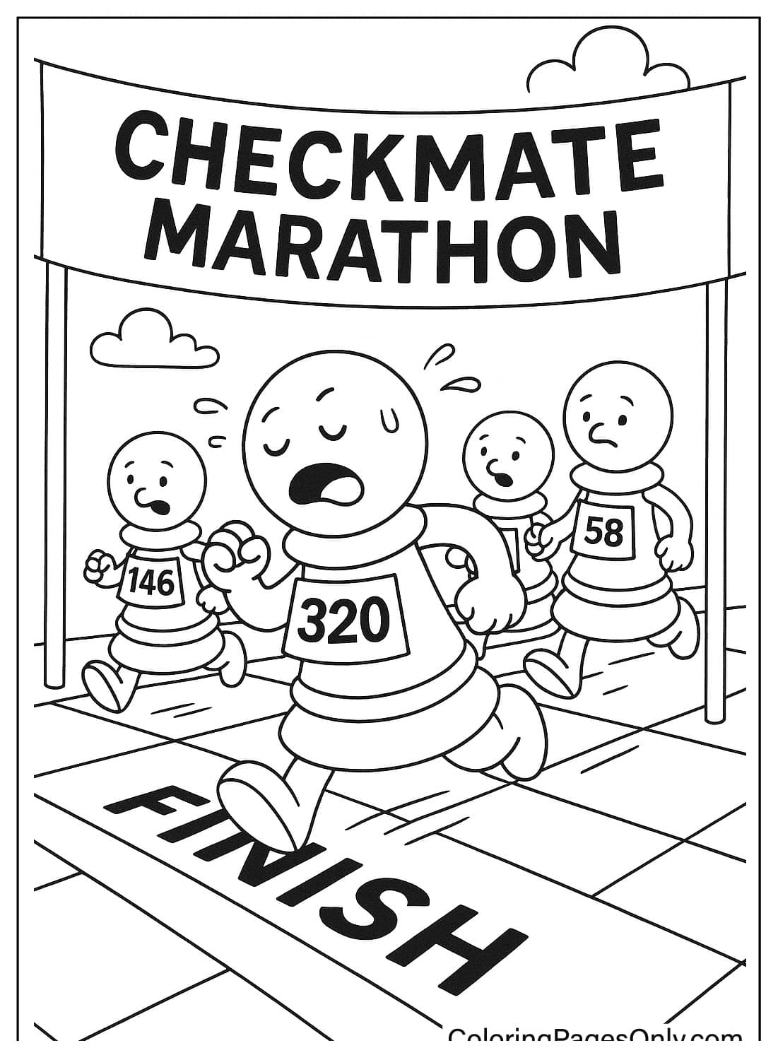 Cheerful Pawns running a marathon, crossing the “Checkmate Marathon” finish line with big smiles.