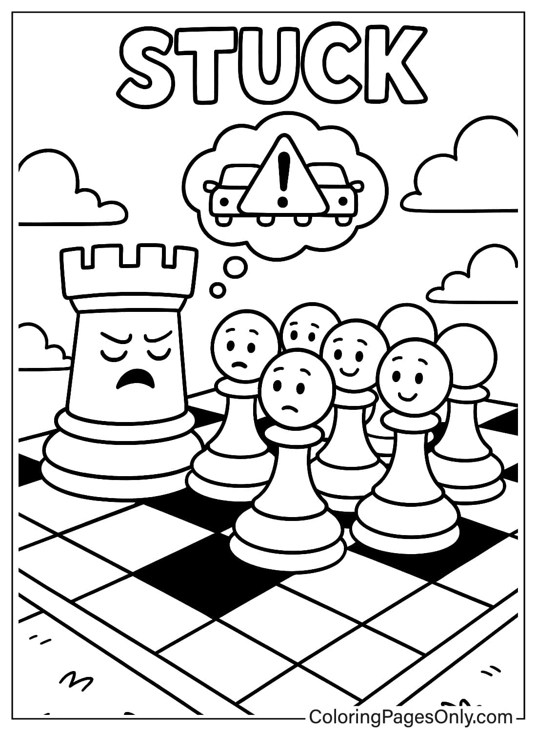 A Rook stuck in traffic because Pawns are blocking the way — a silly and lovable situation to color!