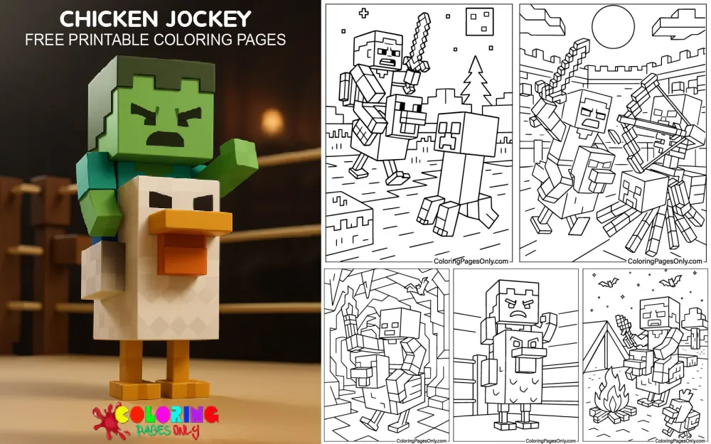 Get ready for some blocky fun with our Chicken Jockey Coloring Pages at Coloringpagesonly.com! Inspired by one of the most amusing and surprising mobs in Minecraft, these pages bring together the cuteness of a baby zombie and the silliness of a chicken — a combination that kids absolutely love!