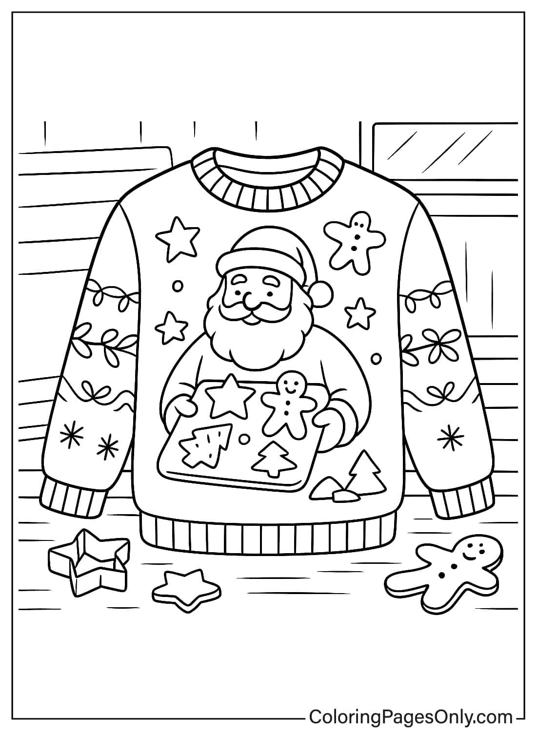 Christmas Sweater Coloring Pages feature black-and-white illustrations of festive sweaters decorated with classic holiday patterns. These designs often include snowflakes, reindeer, stockings, Christmas trees, gingerbread characters, Santa faces, ornaments, and funny âugly sweaterâ graphics.