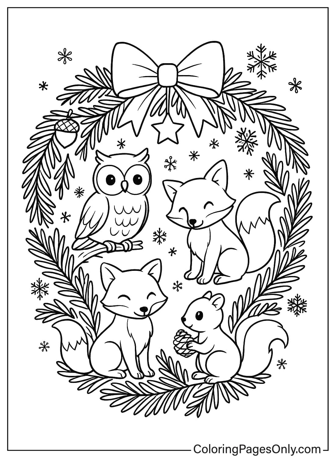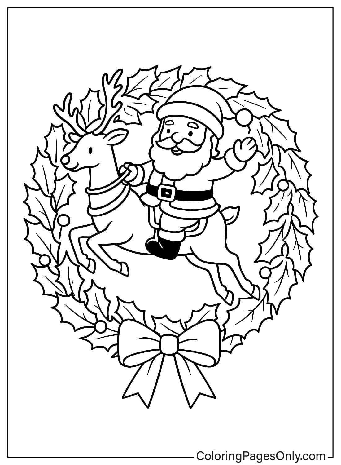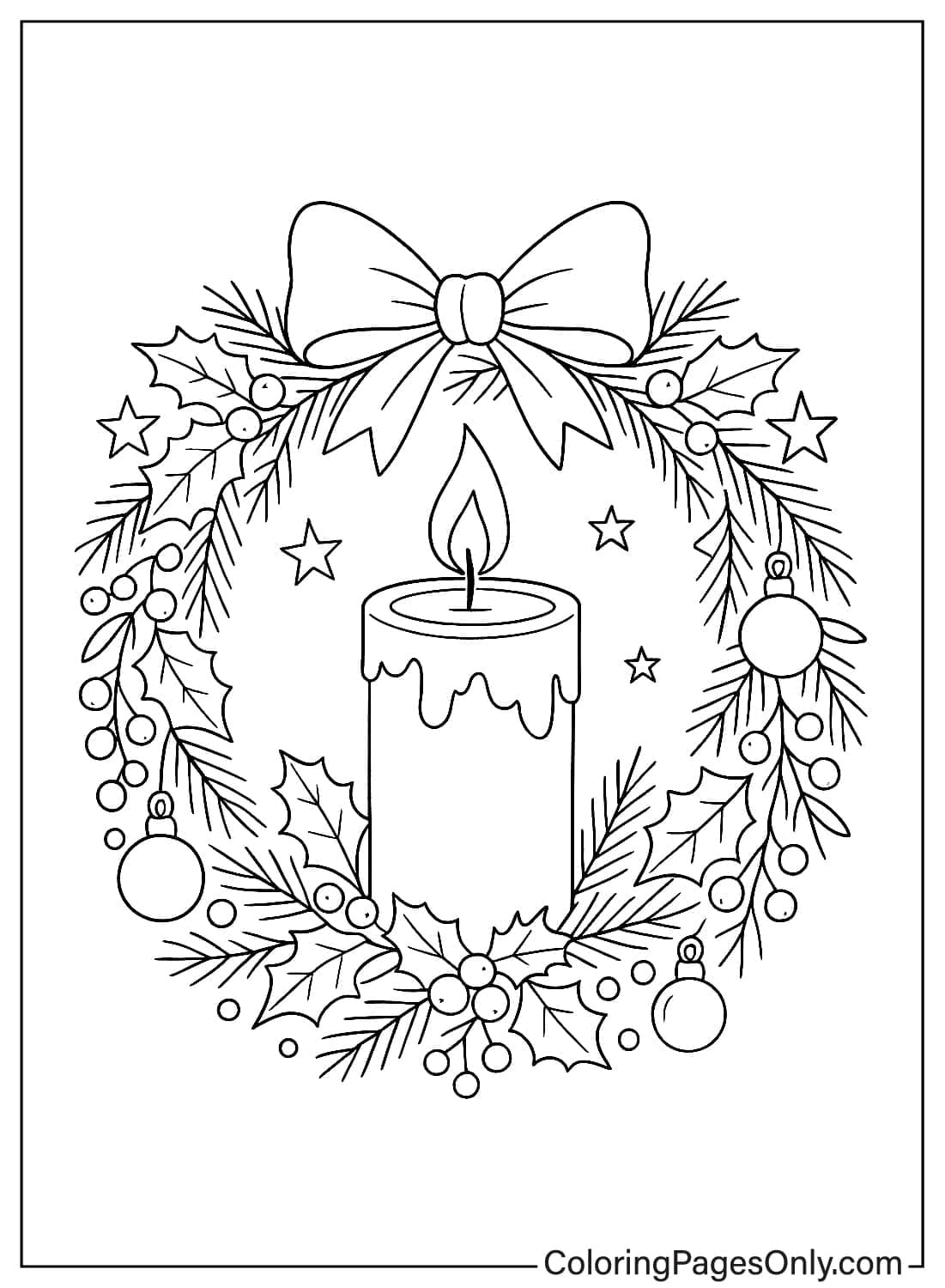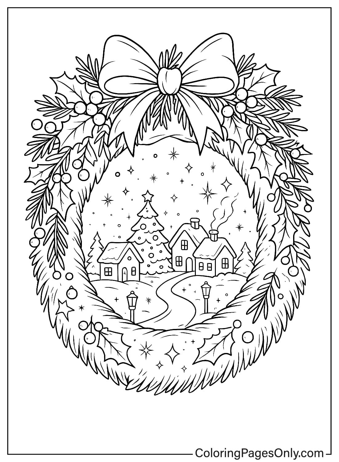 Christmas Wreath Coloring Pages are black-and-white illustrations featuring holiday wreaths decorated with classic Christmas elements such as holly leaves, berries, pine branches, bows, ornaments, bells, snowflakes, candy canes, poinsettias, and winter florals.
