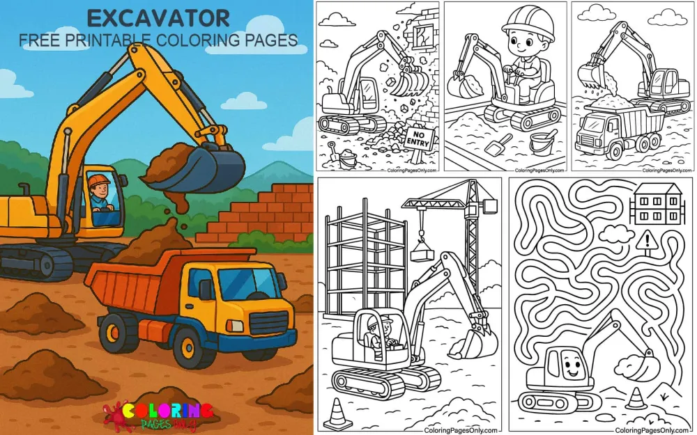 • Turn the colored pages into a mini “Excavator Adventure Book.”