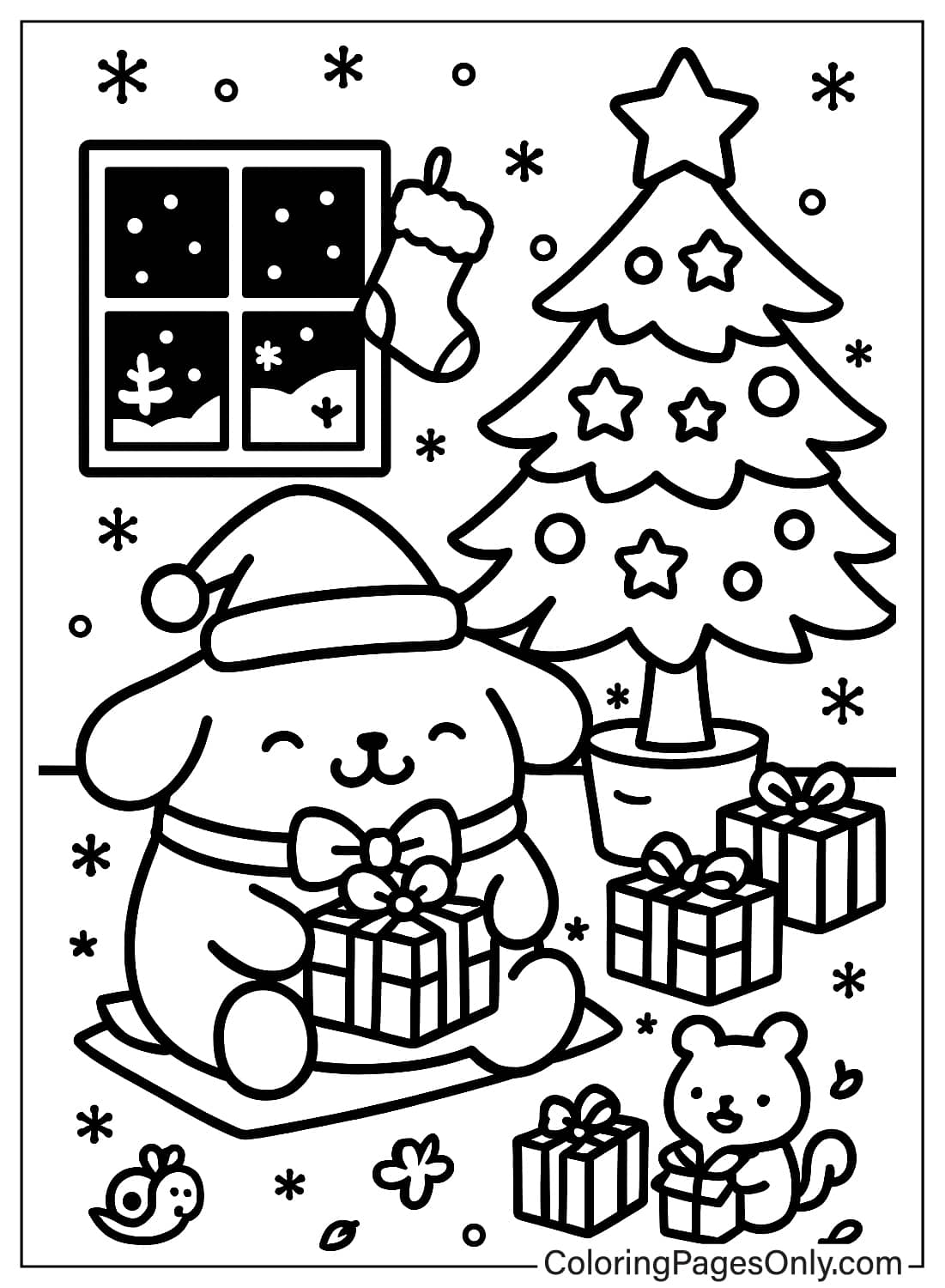 Pompompurin decorates the Christmas tree, hangs stockings, and opens gifts under falling snow. A perfect holiday scene that warms every heart.