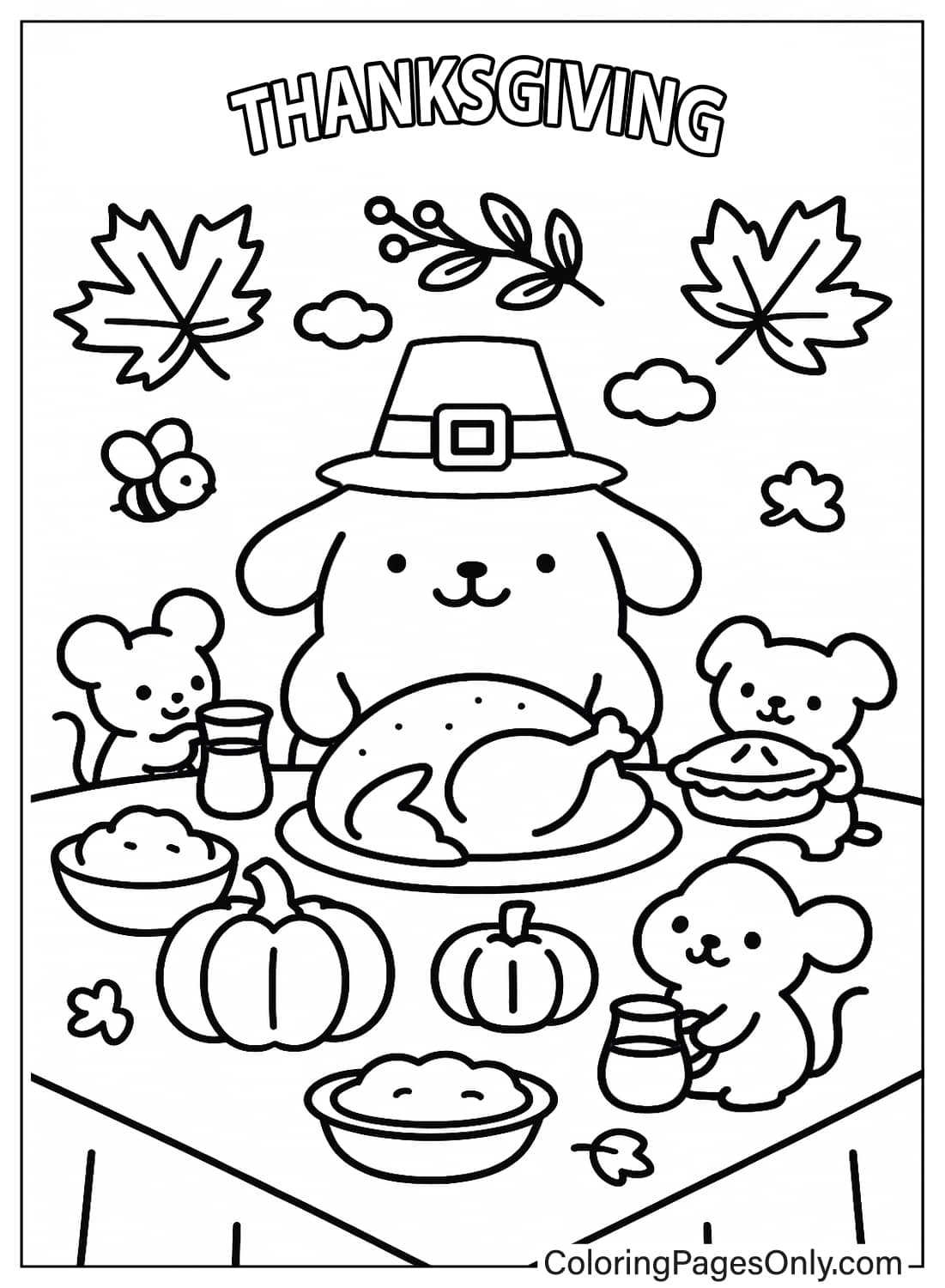 A cozy Thanksgiving dinner where Pompompurin wears a Pilgrim hat, Muffin pours apple juice, and Bagel brings pie. The table is full of turkey, mashed potatoes, and laughter!