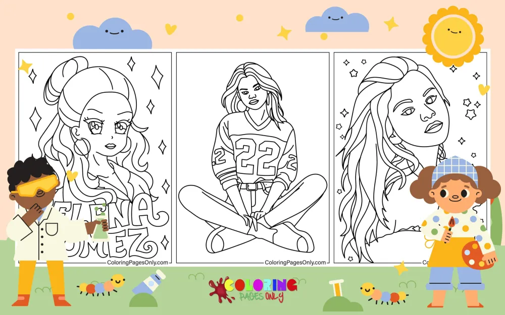 These coloring pages depict Selena Gomez’s iconic moments. You’ll find close-up portraits of Selena, focusing on her beautiful features and signature hairstyle. From red carpet dresses to chic looks, coloring pages let you bring her style to life with your choice of colors.