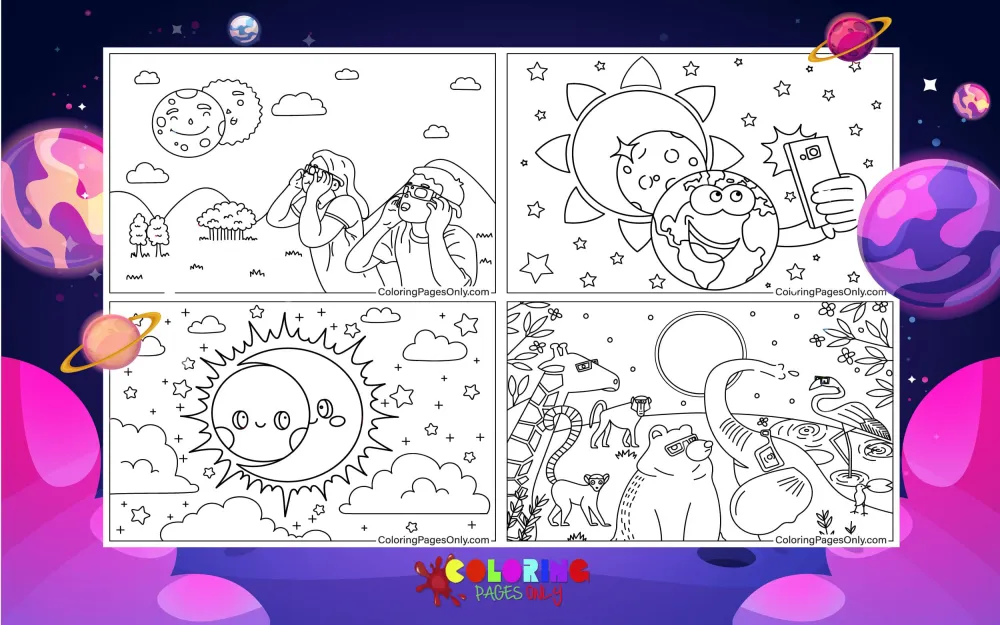Some pages show the Earth, Moon, and Sun during the eclipse. You will choose blue for the Earth, green for the oceans and continents, and the Moon will be light gray. Some exciting and cute scenes are also illustrated, where everyone wears observation glasses, and even the animals do not miss this rare special event. If you’re looking for something more complex, you can choose detailed images of the corona and use different colors to create fiery and swirling effects.